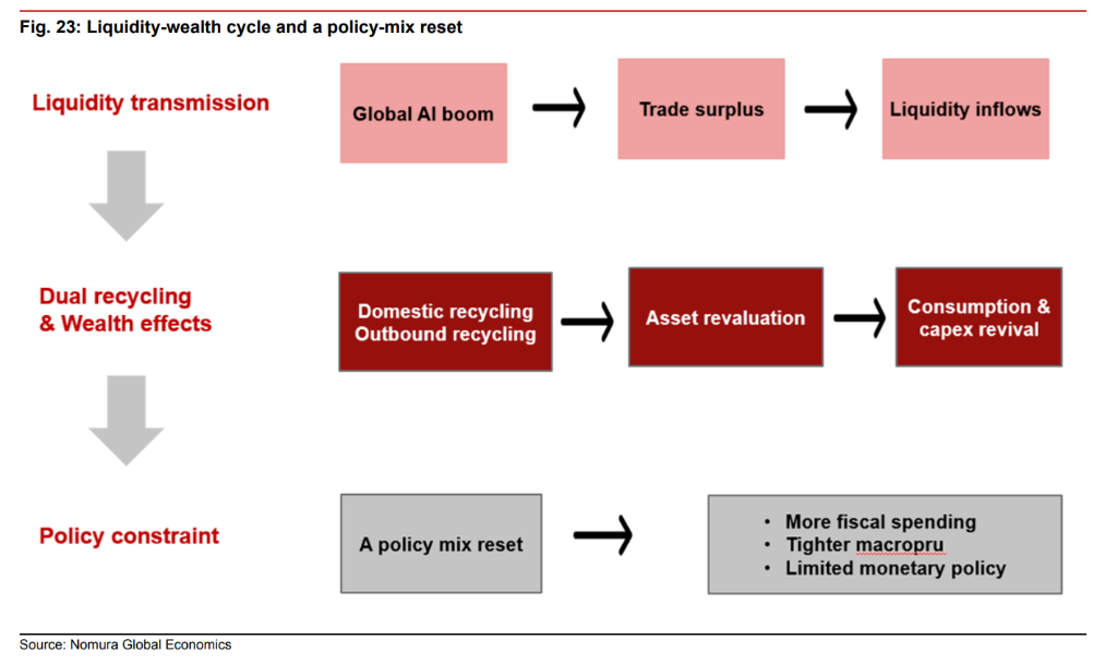财富效应:企业利润飙升和家庭资产升值(房产+股票)正在修复家庭资产负债表。野村估算,这种财富效应将在2026年提振消费增长0.6-0.8个百分点。