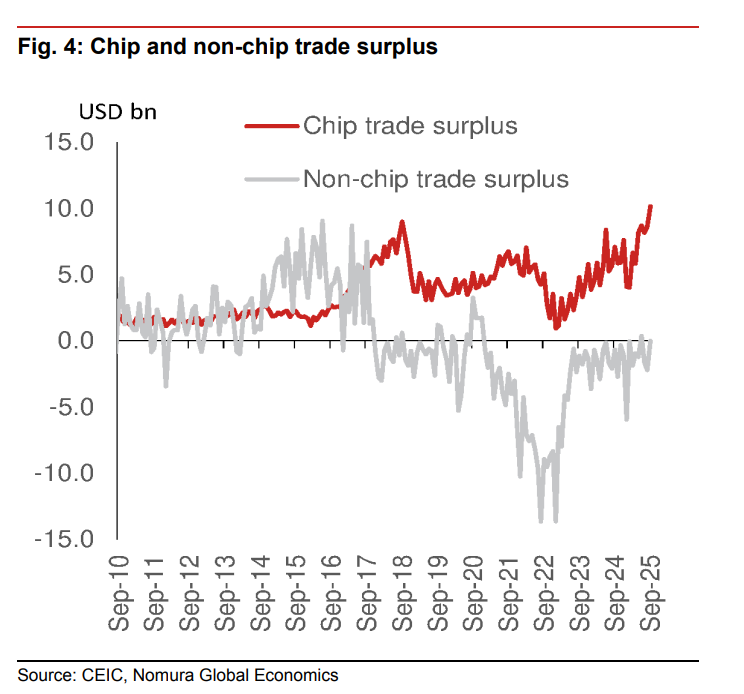 出口数据爆炸:野村预计,芯片出口增长率将从2025年的约25%飙升至2026年的50-60%。